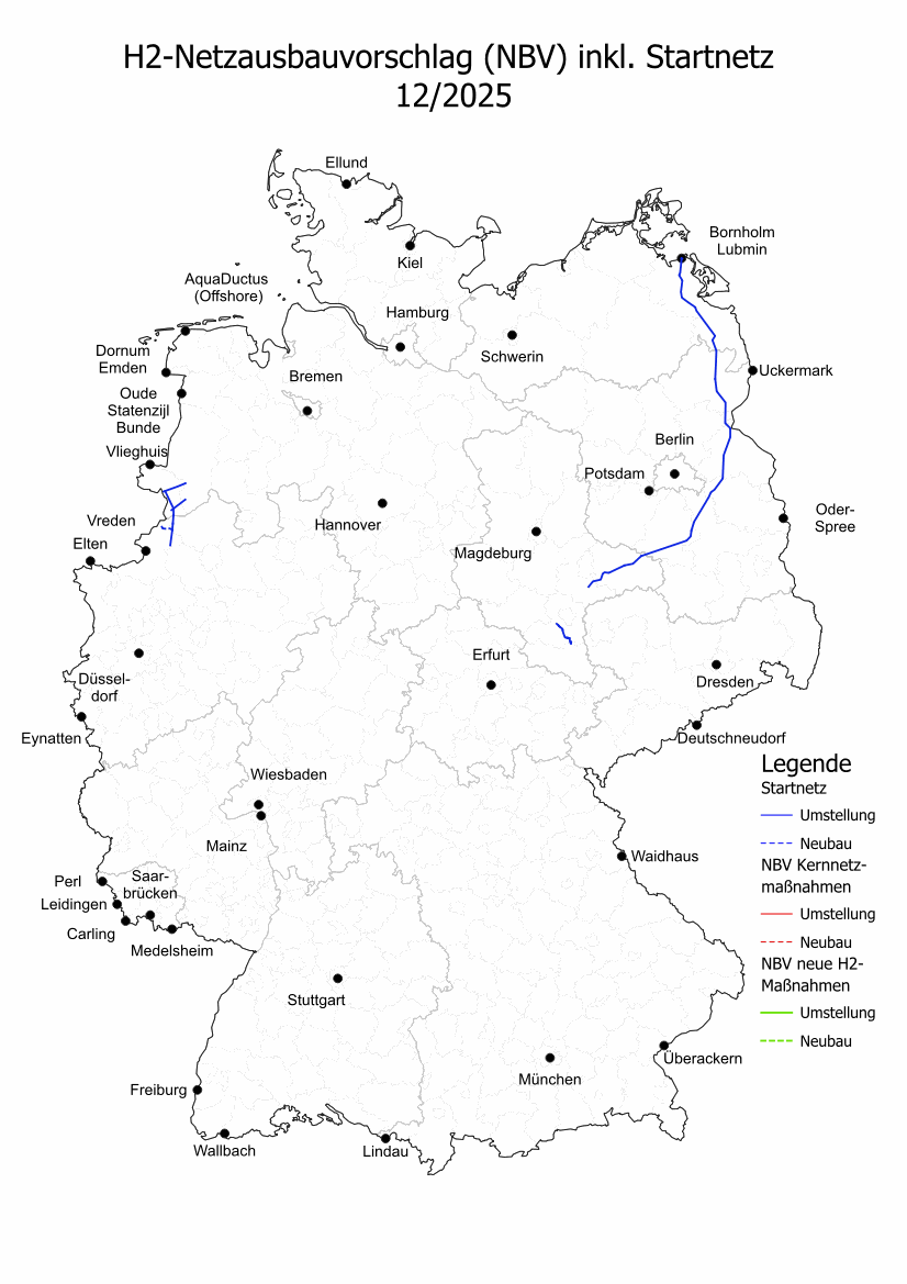Bis Ende 2025 sind bereits mehr als 500 Leitungskilometer des genehmigten Wasserstoff-Kernnetzes realisiert worden. Weitere Maßnahmen befinden sich in der Umsetzung.
